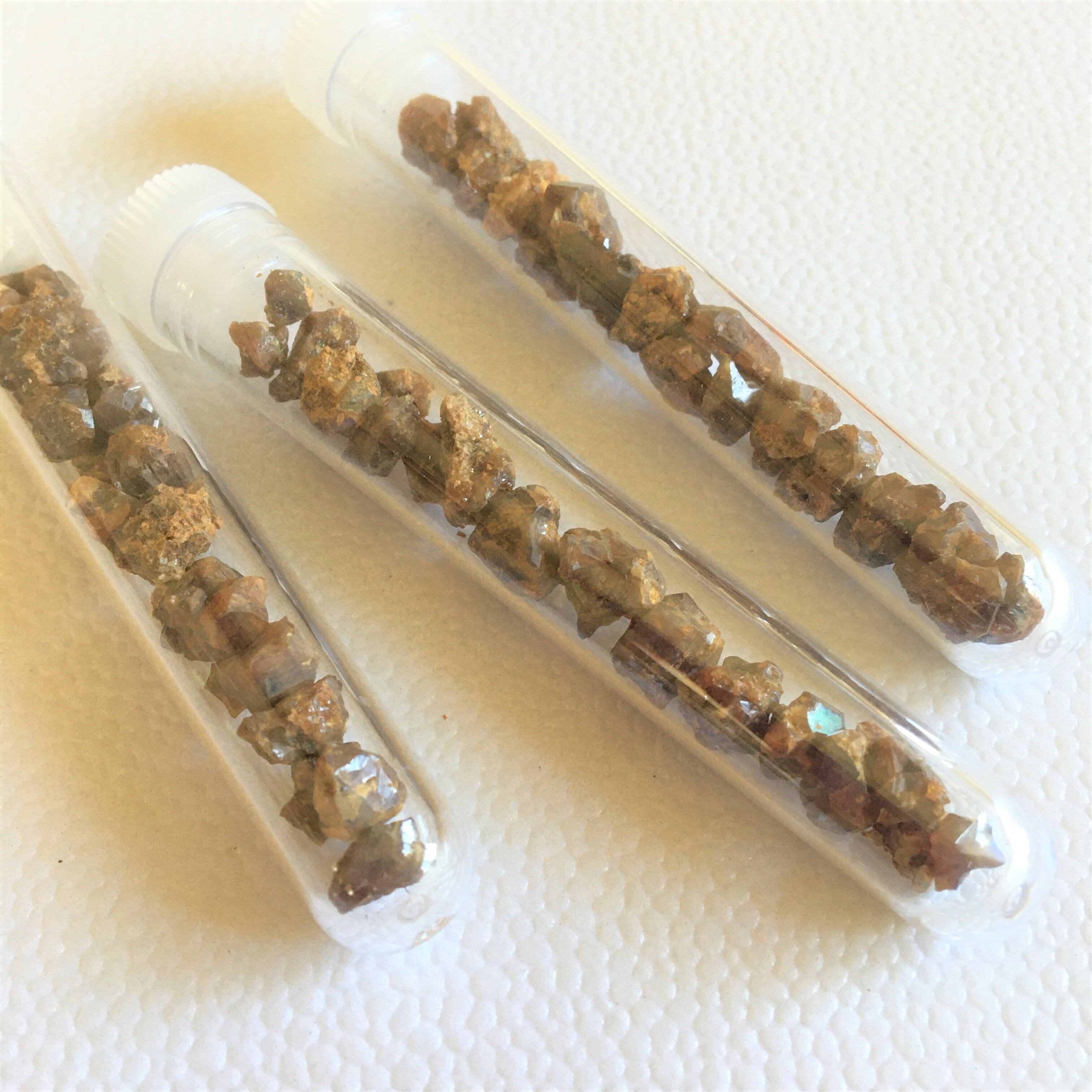 試験管の入れ物に入った国産レインボーガーネットです。